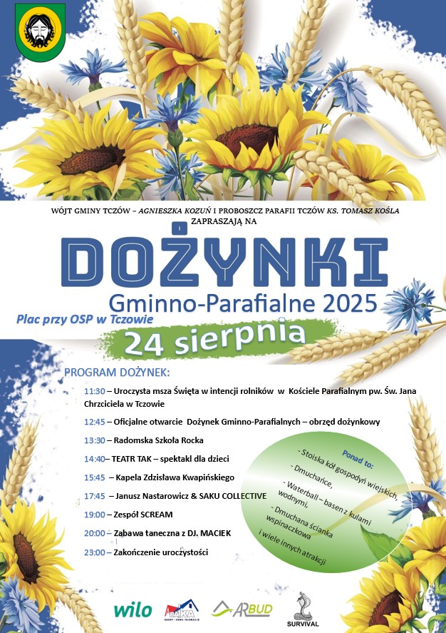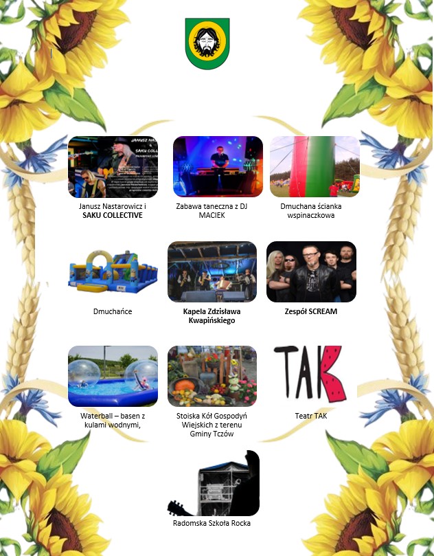 DOŻYNKI GMINNO – PARAFIALNE Wójt Gminy Tczów serdecznie zaprasza na Dożynki Gminno-Parafialne. Przyjdźcie świętować razem z nami zakończenie żniw i podziękować za plony.